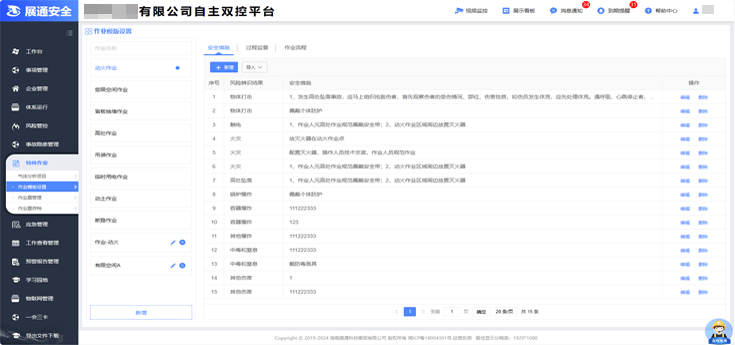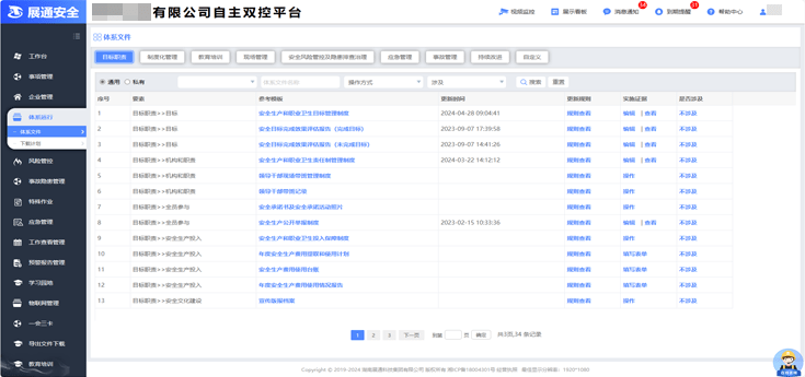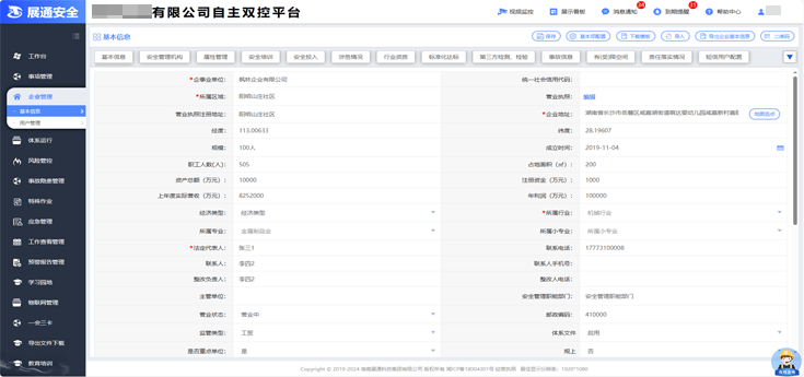 系統提供企業基本信息、安全管理架構、安全投入、涉危情況、行業資質、安全培訓、職業衛生、涉塵涉爆、有(受)限空間、第三方檢測、檢驗等15個功能模塊,可根據企業實際情況進行選用。