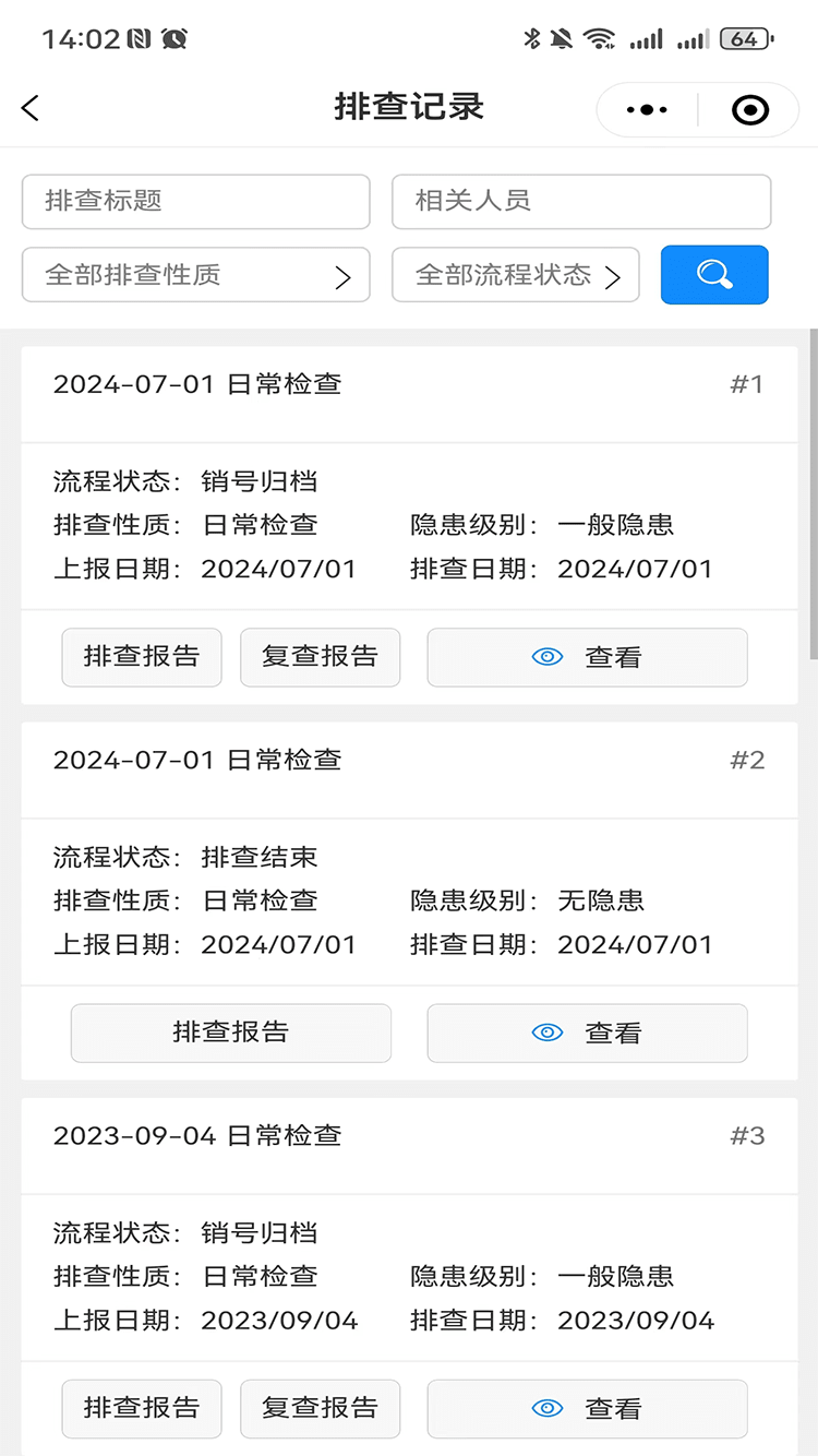 企業安全管理人員可依托檢查表庫、隱患數據庫或者自主新增,完成隱患的排查、上報、整改、復查、歸檔等一系列流程運轉,實現隱患閉環管理;根據隱患排查治理信息,自動生成安全檢查報告,支持線上打印及一鍵導出。