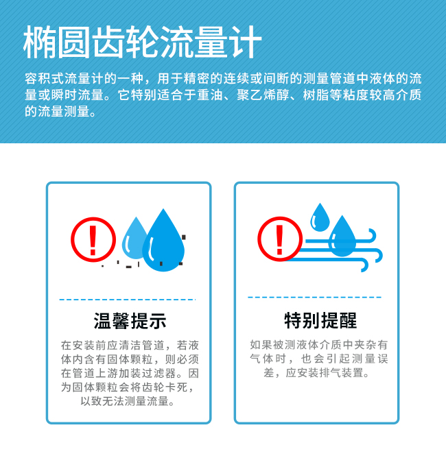 橢圓齒輪流量計計量精度高,適用液體流量的測量,但不適用于含有固體顆粒的流體(固體顆粒會將齒輪卡死,以致無法測量流量)。如果被測液體介質中夾雜有氣體時,也會引起測量誤差。橢圓齒輪流量計是容積式流量計的一種,用于精密的連續(xù)或間斷的測量管道中液體的流量或瞬時流量.它特別適合于重油、聚乙烯醇、樹脂等粘度較高介質的流量測量。
